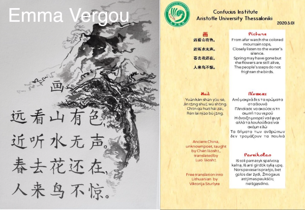 Κινέζικο ποίημα μεταφρασμένο στα αγγλικά, ελληνικά και λιθουανικά και δείγμα γραφής-τέχνης από τη φοιτήτρια του ΙΚ Έμμα Βέργου.