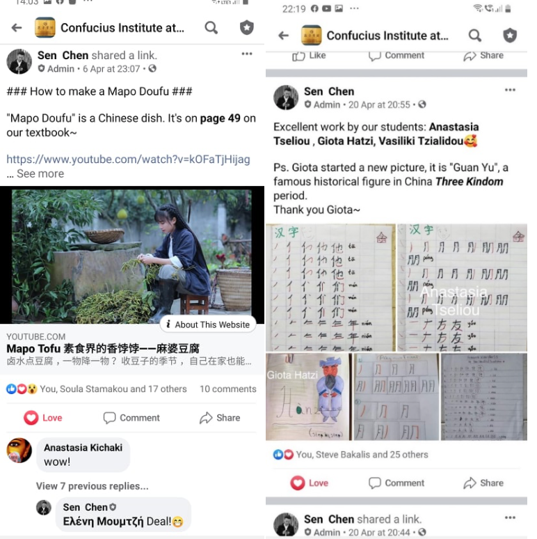 Όταν τα μαθήματα μεταφέρθηκαν σε online μορφή, η επαφή μας με τους/τις φοιτητές/τριές μας παρέμεινε τακτική και το εκπαιδευτικό υλικό έγινε ακόμη πιο πλούσιο, δημιουργικό και ποικίλο. Το ενδιαφέρον των μαθητών/τριών μας για την κινέζικη γλώσσα και την εμβάθυνσή τους σε στοιχεία του κινέζικου πολιτισμού αλλά και της κινέζικης μοντέρνας ζωής παραμένει έντονο και συχνά συγκινητικό.
