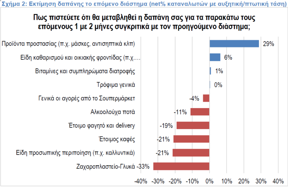 Αντίθετα πτωτικά αναμένεται να κινηθεί η δαπάνη σε είδη ζαχαροπλαστείου, λόγω της υιοθέτησης των μέτρων social distancing (σημειώνεται ότι ακολουθεί η περίοδος των εορτών), αλλά και τα είδη προσωπικής περιποίησης για τους ίδιους λόγους. Η κατανάλωση έτοιμου φαγητού και καφέ επίσης φαίνεται ότι θα παρουσιάσει κάμψη, κάτι που οφείλεται στην παραμονή στο σπίτι, στην τηλεργασία, αλλά και στο γενικότερο καταναλωτικό κλίμα.
