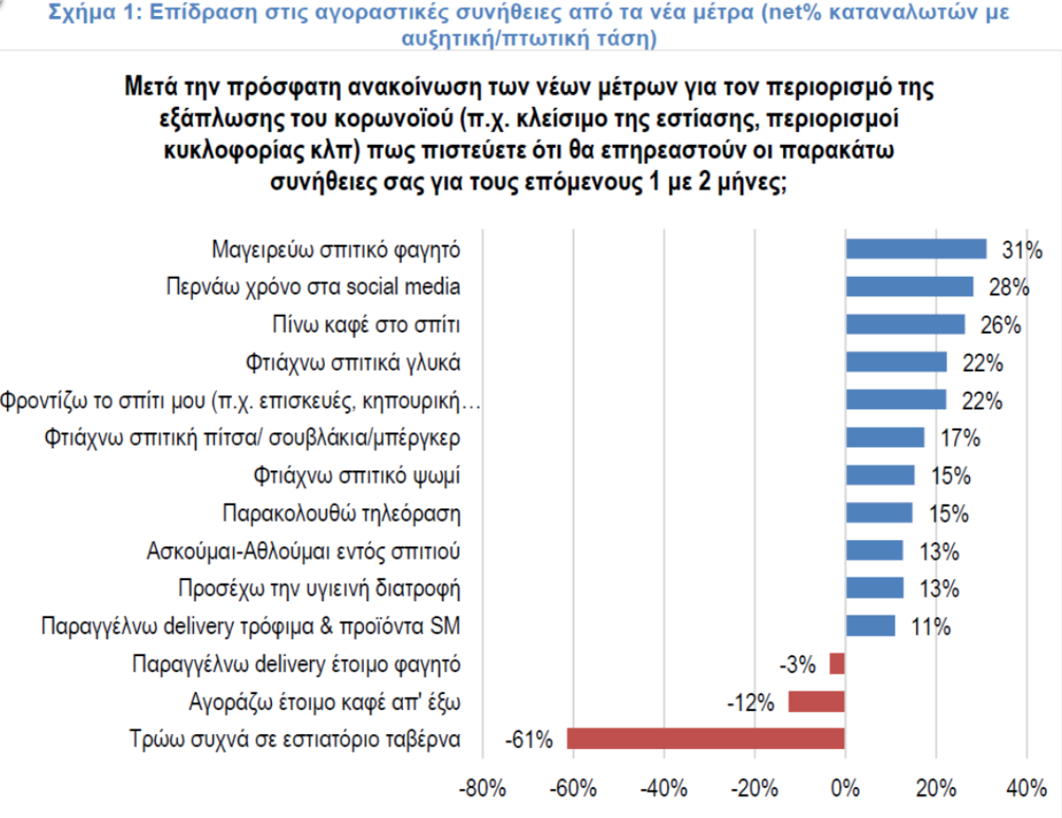 Όπως φαίνεται μετά την ανακοίνωση των νέων μέτρων για τον περιορισμό της εξάπλωσης του κορωνοϊού οι καταναλωτές επιστρέφουν σε συνήθειες που είχαν υιοθετήσει την περίοδο του πρώτου Lockdown την άνοιξη του 2020. Συγκεκριμένα, όπως φαίνεται στο σχήμα 1, σίγουρα η μεγαλύτερη διαφοροποίηση είναι η μείωση της εστίασης (ένα μεγάλο ποσοστό ήδη και πριν το κλείσιμο της εστίασης δεν την επέλεγε), ενώ φαίνεται ότι πέρα από την κατανάλωση τροφίμων σε εστιατόρια καθήμενοι αναμένεται να επηρεαστούν και κατ’ οίκον παράδοση-κατανάλωση, αλλά και η παραλαβή take-away από το κατάστημα. Αντίθετα φαίνεται ότι αυξάνονται σημαντικά τρεις συνήθειες των καταναλωτών: