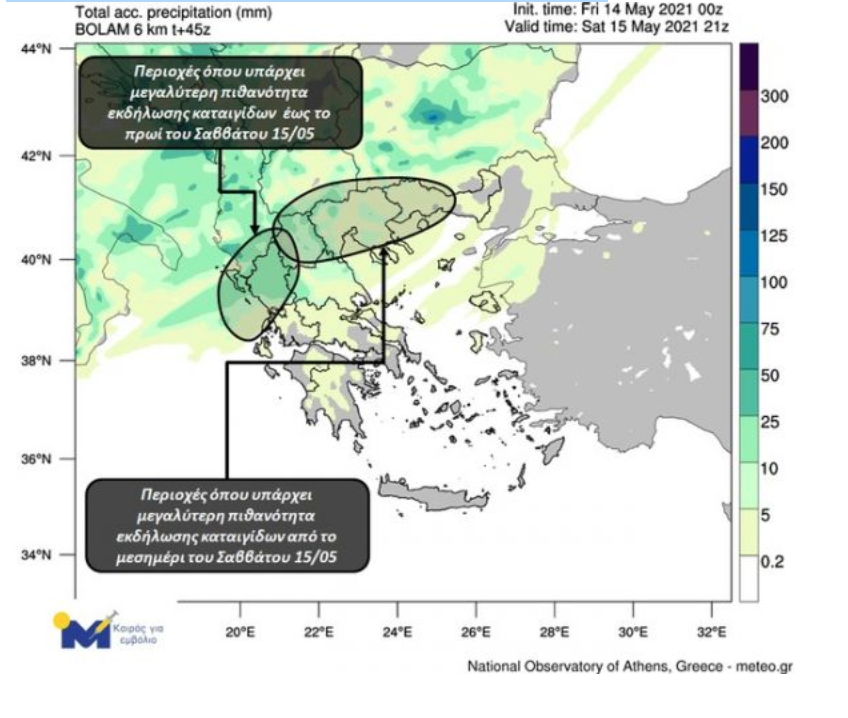 Στην Εικόνα 2 παρουσιάζεται ο ολικός υετός (βροχές/καταιγίδες) που αναμένεται έως το βράδυ του Σαββάτου 15/05 καθώς και οι περιοχές όπου υπάρχει μεγαλύτερη πιθανότητα εκδήλωσης καταιγίδων.