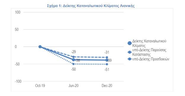 Καταρχάς, ο δείκτης καταναλωτικού κλίματος λιανικής, τον Δεκέμβριο του 2020 διαμορφώθηκε στο -39, σαφώς μειωμένος σε σχέση με τον μήνα βάσης, τον Οκτώβριο του 2019 και ελαφρώς μειωμένος σχέση με τη μέτρηση του Ιουνίου 2020. Όπως φαίνεται, η συγκεκριμένη εξέλιξη δεν έχει να κάνει τόσο με τις μέχρι σήμερα οικονομικές εξελίξεις, αλλά κυρίως λόγω των μειωμένων προσδοκιών των καταναλωτών για το προσεχές διάστημα. Συγκεκριμένη η μείωση στον υπο-Δείκτη παρούσας κατάστασης ήταν περιορισμένη στο -31, ενώ αντίθετα ο υπό-δείκτης προσδοκιών παρουσίασε μεγάλη πτώση και έπεσε στο -51.