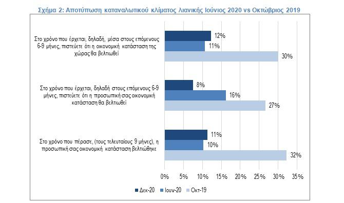 Αυτό σημαίνει ότι μέχρι σήμερα η διαχείριση του οικονομικού σκέλους της κρίσης του COVID-19 οδήγησε σε μία οικονομική κατάσταση των καταναλωτών σαφώς χειρότερη σε σχέση με το προηγούμενο έτος, αλλά που προκαλεί μεγαλύτερη ανησυχία σε σχέση στο καταναλωτικό κοινό για το επερχόμενο χρονικό διάστημα. Αυτό άλλωστε αποτυπώνεται και στις επί μέρους ερωτήσεις (σχήμα 2), όπου φαίνεται ότι τόσο τον προηγούμενο χρόνο η οικονομική κατάσταση μεγάλου μέρους του καταναλωτικού κοινού χειροτέρεψε (πτώση ποσοστού από 32% σε 11%), όσο και ότι το επόμενο 6μηνο η εκτίμηση μεγάλου μέρους του καταναλωτικού κοινού είναι ότι θα χειροτερέψει ακόμα περισσότερο για τους ίδιους και τη χώρα (πτώση από 30% σε 12% και από 27% σε 8%).