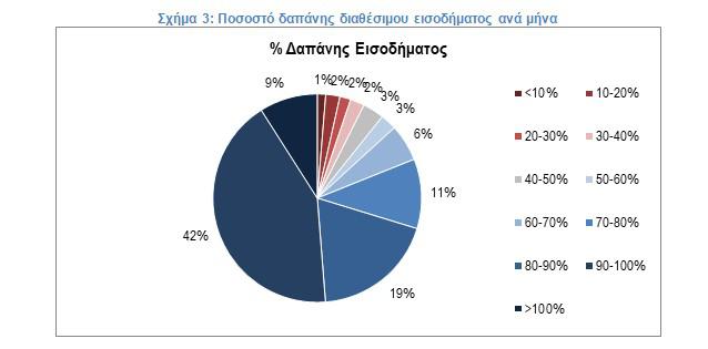Καταγράφεται επίσης η οικονομική πίεση που ήδη αντιμετωπίζει το Ελληνικό καταναλωτικό κοινό. Όπως φαίνεται στο σχήμα 3, το 70% του κοινού ξοδεύει πάνω από το 80% του διαθέσιμου εισοδήματος του σε μηνιαία βάση, ενώ το 9% ξοδεύει πάνω από 100%, πρακτικά δηλαδή δανείζεται με κάποιον τρόπο για να καλύψει τις ανάγκες του.