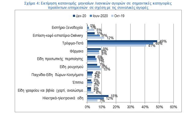 Οι δαπάνες για αγορές προϊόντων αντιπροσωπεύουν περίπου το 31% των συνολικών δαπανών. Στην κατανομή των λιανικών αγορών στις παραπάνω δαπάνες αποτυπώνεται η επίδραση της κρίσης του COVID-19. Όπως καταγράφεται στο σχήμα 4, η κύρια κατηγορία αγορών όσον αφορά τις δαπάνες, οι οποίες αντιπροσωπεύουν περίπου τη μισή αξία, είναι τα τρόφιμα και ποτά με ποσοστό 49% με αύξηση από 41% το 2019. Η εστίαση η οποία πέρυσι βρισκόταν στη δεύτερη θέση υποχωρεί από 12% σε 5% και τα εισιτήρια ξενοδοχεία από 5% σε μόλις 1%. Αντίθετα, αύξηση παρουσιάζουν τα ηλεκτρικά-ηλεκτρονικά είδη από 7% σε 15%, κάτι που αντικατοπτρίζει τις αγορές της περιόδου Black Friday.