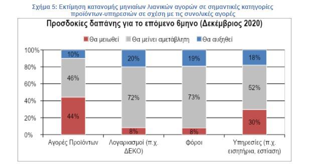 Οι προσδοκίες για τις δαπάνες είναι επίσης αρνητικές. Όπως καταγράφεται στο σχήμα 5, το 44% εκτιμά ότι οι δαπάνες για αγορές προϊόντων το πρώτο εξάμηνο 2021 θα είναι μειωμένες, ενώ μόλις το 10% ότι θα είναι αυξημένες. Το ίδιο ισχύει για τις υπηρεσίες (εισιτήρια, εστίαση) για τα οποία επίσης εκτιμάται από το 30% του κοινού μείωση – παρότι είναι ήδη κλειστοί οι κλάδοι αυτοί – και μόλις 18% αύξηση. Αυξητική τάση καταγράφεται όμως για τις πάγιες δαπάνες όπως λογαριασμοί (20% αύξηση έναντι 8% μείωση) και φορολογία (19% αύξηση έναντι 8% μείωση).