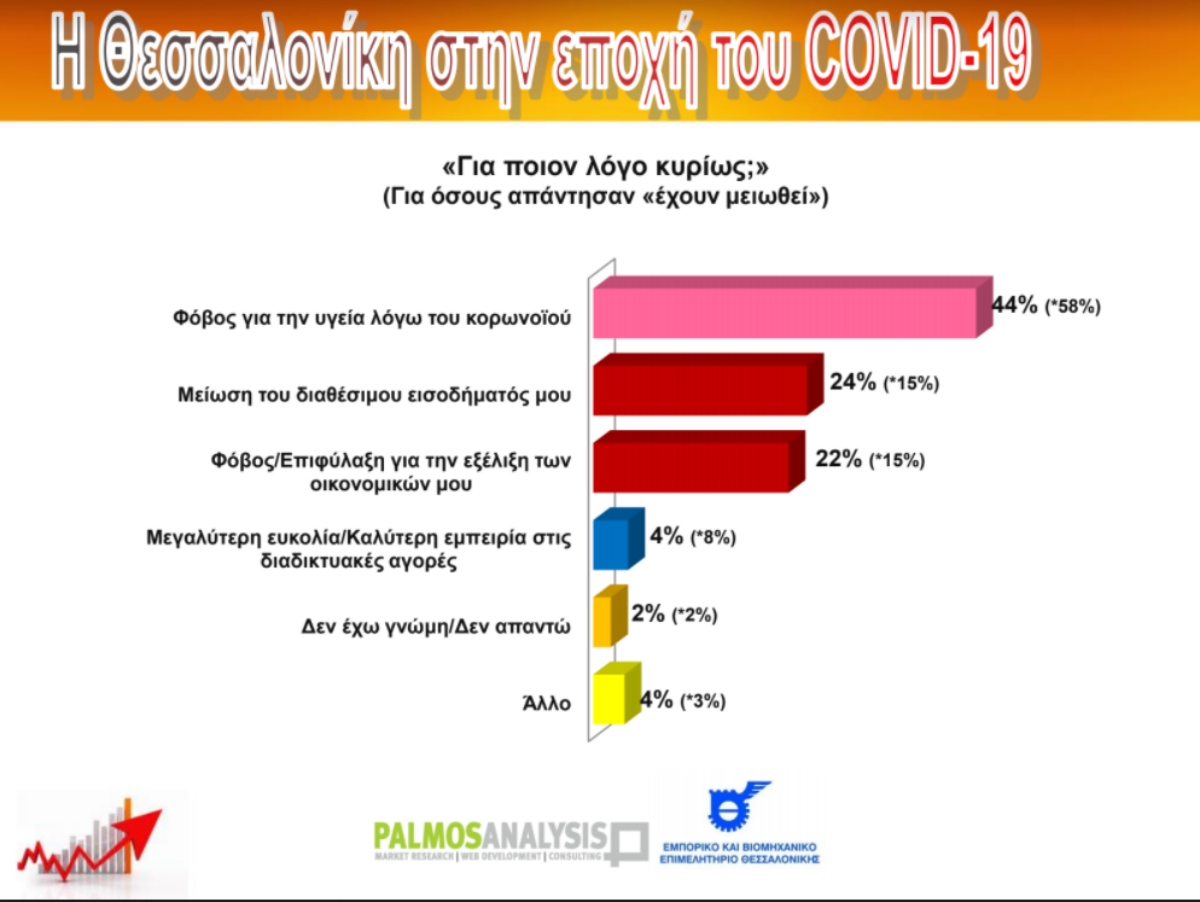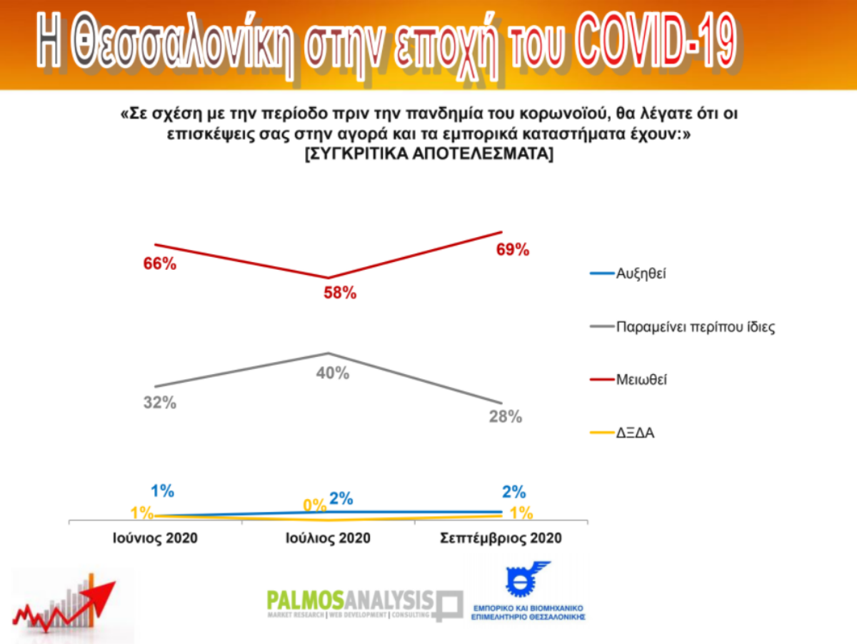 Σχεδόν 7 στους 10 ερωτηθέντες (69%) δηλώνουν ότι έχουν μειώσει τις επισκέψεις τους στην αγορά και τα εμπορικά καταστήματα σε σχέση με την χρονική περίοδο πριν την πανδημία του κορονοϊού. Το ποσοστό αυτό είναι το υψηλότερο που έχει καταγραφεί στις κυλιόμενες έρευνες του ΕΒΕΘ για τις συνέπειες από την πανδημία του κορoνοϊού και αντικατοπτρίζει τα αρνητικά αποτελέσματα που καταγράφονται στις προσδοκίες καταναλωτών και επιχειρήσεων του «Βαρόμετρου ΕΒΕΘ».