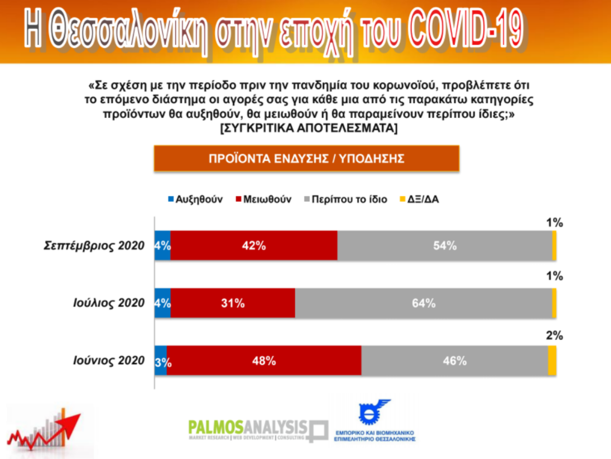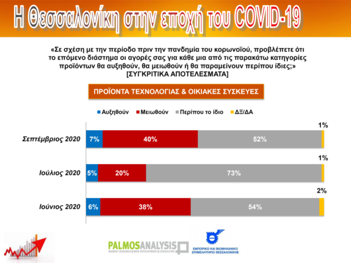 Ενισχυμένες είναι οι αγορές μέσω διαδικτύου από την πανδημία του κορονοϊού, καθώς το 30% των καταναλωτών στον Νομό Θεσσαλονίκης δηλώνουν ότι έχουν αυξήσει τις διαδικτυακές αγορές τους έναντι 11% που δηλώνουν ότι τις έχουν μειώσει ενώ το 52% δηλώνουν ότι δεν έχει υπάρξει κάποια αξιόλογη μεταβολή. Ιδιαίτερα ανησυχητικό είναι το ότι μεγάλο ποσοστό των καταναλωτών προβλέπουν ότι το επόμενο διάστημα οι αγορές τους για διάφορες κατηγορίες προϊόντων για μειωθούν σε σχέση με την περίοδο πριν την πανδημία του κορoνοϊού: 42% σε προϊόντα ένδυσης/υπόδησης (31% τον Ιούλιο), 40% σε προϊόντα τεχνολογίας και οικιακές συσκευές (20% τον Ιούλιο) και 50% σε σημαντικές αγορές όπως αυτοκίνητα, έπιπλα κτλ (23% τον Ιούλιο).