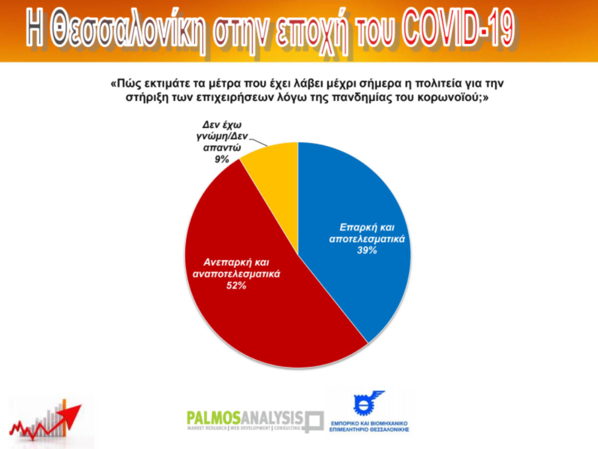 Σε σχέση με τις επιπτώσεις από την πανδημία του κορονοϊού, 8 στις 10 περίπου επιχειρήσεις του Νομού Θεσσαλονίκης αναφέρουν μείωση του κύκλου εργασιών τους εξαιτίας της πανδημίας COVID-19, ενώ το 52% θεωρούν ανεπαρκή και αναποτελεσματικά τα μέτρα στήριξης των επιχειρήσεων που έχει λάβει μέχρι σήμερα η πολιτεία λόγω της πανδημίας του κορονοϊού, έναντι 39% που τα θεωρούν επαρκή και αποτελεσματικά.