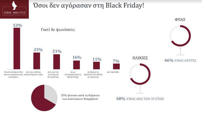 Όσοι δεν αγόρασαν κάτι, το έκαναν κυρίως γιατί λένε πως δε γίνονται πραγματικές εκπτώσεις στην Ελλάδα (53%), δεν έχουν ανάγκη κάποιο προϊόν (23%) και δεν είχαν την οικονομική δυνατότητα (21%).