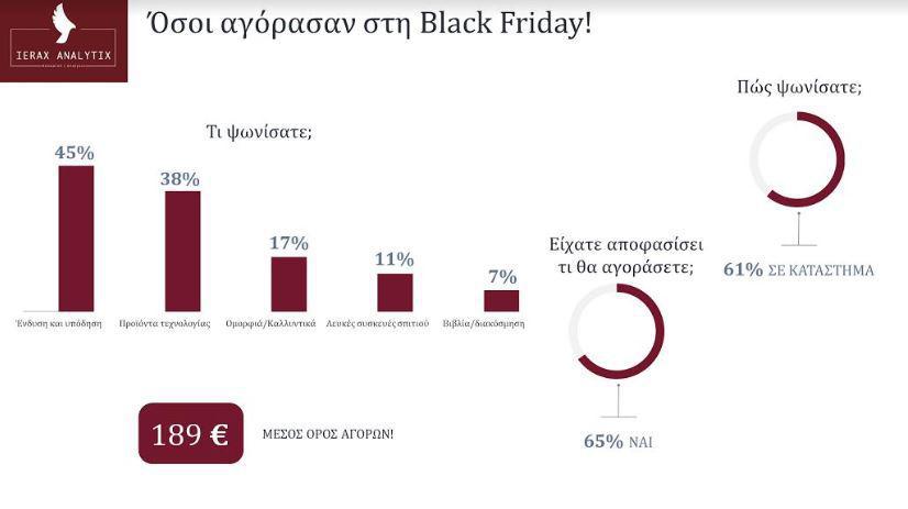 Οι περισσότεροι ψώνισαν με επίσκεψη σε κάποιο κατάστημα (61%) και οι υπόλοιποι διαδικτυακά. Είναι σημαντικό πως 1 στους 3 είχε αποφασίσει από πριν τι θα αγοράσει αλλά 33% αγόρασε αυθόρμητα κάποιο προϊόν. Για τον εαυτό τους αγόρασαν κάτι οι περισσότεροι (70%), για την οικογένεια και τα παιδιά τους (22%), γενικά για το σπίτι (19%) και για τον/την σύντροφο (10%). Τέλος, περίπου 189 ευρώ έδωσε ο κάθε αγοραστής συνολικά στη διάρκεια της Black Friday.