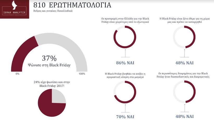 Συγκεκριμένα 37% αγόρασε κάποιο προϊόν έναντι 32% το 2017. Στο σύνολο τους οι ερωτώμενοι νιώθουν πως οι προσφορές στην Ελλάδα για την Black Friday είναι χειρότερες από το εξωτερικό (86%), διαφωνούν με το να καταργηθεί η Black Friday (52%), θεωρούν πως η Black Friday βοηθάει στην αγοραστική κίνηση των καταστημάτων (70%) και νιώθουν πως οι περισσότερες διαφημίσεις για την Black Friday δεν ήταν διασκεδαστικές και διαφορετικές (52%).