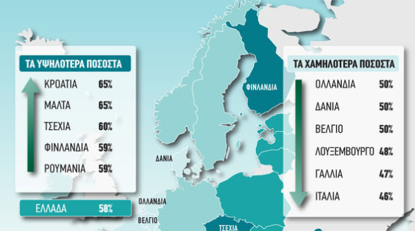 Σύμφωνα με πληροφορίες από σχετική έρευνα της @EU_Eurostat για την υγεία των πολιτών στην Ευρώπη, πάνω από τους μισούς ενήλικες στην Ε.Ε. είναι υπέρβαροι. Όπως μπορούμε να δούμε και στο παραπάνω γράφημα από το ΑΠΕ-ΜΠΕ, τα υψηλότερα ποσοστά σημειώνονται στην Κροατία, Μάλτα, Τσεχία, Φινλανδία και Ρουμανία, με την Ελλάδα να βρίσκεται στην 6η θέση με το ποσοστό παχυσαρκίας να αγγίζει το 58%. Παράλληλα, τις χαμηλότερες θέσεις καταλαμβάνουν η Ολλανδία, Δανία, Βέλγιο, Λουξεμβούργο, Γαλλία και Ιταλία.