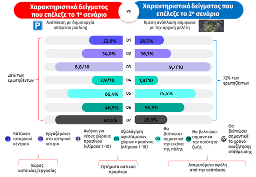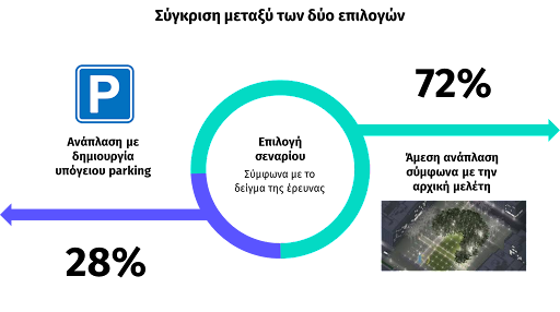 Κατά τη διάρκεια της ηλεκτρονικής συμπλήρωσης του ερωτηματολογίου, οι συμμετέχοντες είχαν τη δυνατότητα να διαβάσουν μια σύντομη περιγραφή του ιστορικού της ανάπλασης της Πλατείας Ελευθερίας, του αρχικού σχεδίου (που προέβλεπε την μετατροπή της περιοχής σε χώρο πρασίνου και αναψυχής που θα συμβάλλει στη βιοκλιματική αναβάθμιση της περιοχής και θα δημιουργήσει ταυτόχρονα και έναν τόπο μνήμης για τους χιλιάδες Εβραίους της Θεσσαλονίκης που μαρτύρησαν στα ναζιστικά στρατόπεδα), του αρχικού χρονοδιαγράμματος, των προβλημάτων που ακολούθησαν, και του νέου προτεινόμενου σχεδίου που περιλαμβάνει τη δημιουργία υπόγειου parking (περίπου 200 θέσεων), με την ταυτόχρονη προσωρινή λύση του υπαίθριου parking. Επισημάνθηκαν ακόμα οι κυριότεροι προβληματισμοί σχετικά με τη δημιουργία ενός υπόγειου parking στον συγκεκριμένο χώρο (κυρίως από τη σκοπιά του αυξημένου κόστους κατασκευής και της πιθανής καθυστέρησης υλοποίησης του έργου). Κατόπιν τούτου, οι συμμετέχοντες στην έρευνα κλήθηκαν να επιλέξουν μεταξύ δύο εναλλακτικών σεναρίων: (α) την υλοποίηση του νέου προτεινόμενου σχεδίου, που συμπεριλαμβάνει τη δημιουργία του υπόγειου πάρκινγκ, και (β) την άμεση υλοποίηση του αρχικού σχεδίου ανάπλασης. Όπως φαίνεται από τα αποτελέσματα της έρευνας, η κυρίαρχη επιλογή των κατοίκων ήταν η άμεση υλοποίηση της αρχικής μελέτης. Συγκεκριμένα, το 72% των ερωτηθέντων επέλεξε το συγκεκριμένο σενάριο, ενώ μόλις το 28% προτίμησε το σχέδιο που περιλάμβανε και τη δημιουργία του υπόγειου parking.