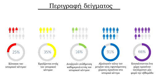 Αναφορικά με τους χώρους πρασίνου, η μεγάλη πλειοψηφία των συμμετεχόντων (91%) φαίνεται να αξιολογεί κάτω του μετρίου (με βαθμό κάτω από το 5 σε μια κλίμακα από 1 έως 10) την ποιότητα και την επάρκεια των υφιστάμενων χώρων πρασίνου στο ιστορικό κέντρο (επιβεβαιώνοντας τα αποτελέσματα προηγούμενης έρευνάς μας), ενώ το 66% του δείγματος επισκέπτεται έναν χώρο πρασίνου τουλάχιστον μία φορά την εβδομάδα. Αξίζει ακόμα να σημειωθεί ότι το σύνολο των συμμετεχόντων έδωσε μια σαφώς χαμηλότερη μέση τιμή αξιολόγησης των υφιστάμενων χώρων πρασίνου στο ιστορικό κέντρο (2,1/10) σε σχέση με το υπόλοιπο πολεοδομικό συγκρότημα (3,1/10), ενώ η δημιουργία νέων χώρων πρασίνου θεωρήθηκε εξίσου σημαντική, με βαθμολογία 9,4/10 και για τις δύο χωρικές κλίμακες, φανερώνοντας έτσι την απόλυτη προτεραιότητα/ανάγκη που υπάρχει για τέτοιες παρεμβάσεις, τόσο σε επίπεδο πολεοδομικού συγκροτήματος, όσο και στην περιοχή του ιστορικού κέντρου.