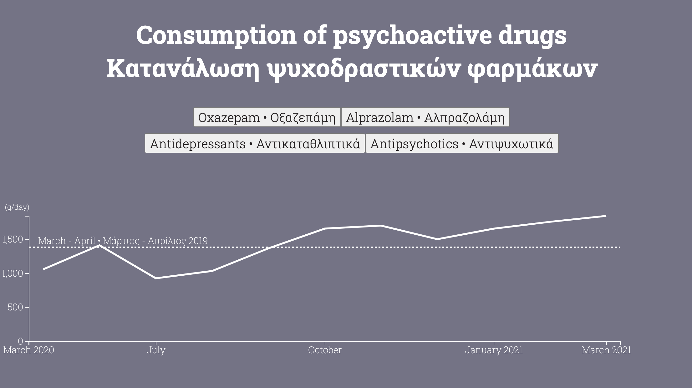 Η ανάλυση των δεδομένων δείχνει ότι για την Οξαζεπάμη η χρήση της σχεδόν διπλασιάστηκε, με τον Μάρτιο του 2020 να καταγράφεται κατανάλωση 1.056 γρ. ανά ημέρα ενώ τον Μάρτιο του 2021, 1.843 γρ. ανά ημέρα. Η Αλπραζολάμη που αποτελεί και το πιο γνωστό είδος ηρεμιστικού, όπως φαίνεται και στο παραπάνω γράφημα σημειώνει κατακόρυφη αύξηση. Ραγδαία και η αύξηση των αντικαταθλιπτικών με τον Μάρτιο του 2019 να καταγράφεται χρήση 3.700 γρ. ανά ημέρα, έναν χρόνο μετά 5.494 γρ. και τον Μάρτιο του 2021 6.053 γρ. ανά ημέρα.