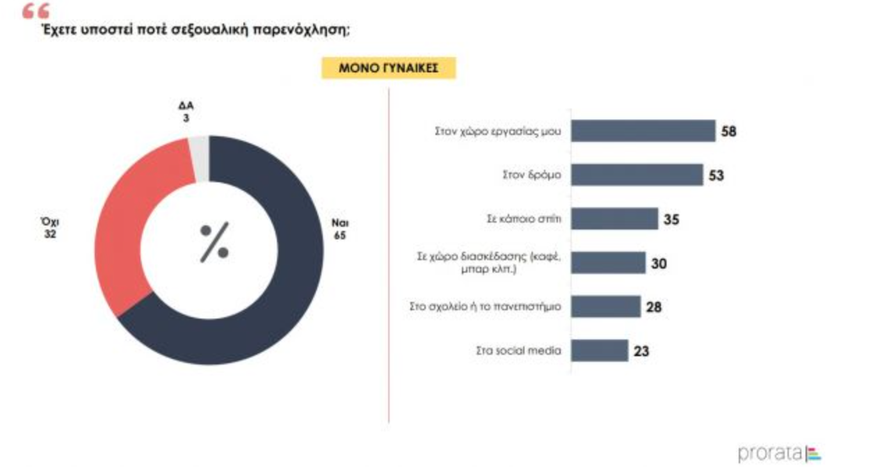 Το 65% των γυναικών δηλώνει ότι έχει υπάρξει θύμα σεξουαλικής παρενόχλησης ή κακοποίησης με τους χώρους εργασίας και τα περιστατικά στον δρόμο να αποτελούν τα πιο συνηθισμένα μέρη στα οποία βιώνονται οι επιθέσεις, σύμφωνα με τα ευρήματα έρευνας που διενέργησε η PRORATA S.A.