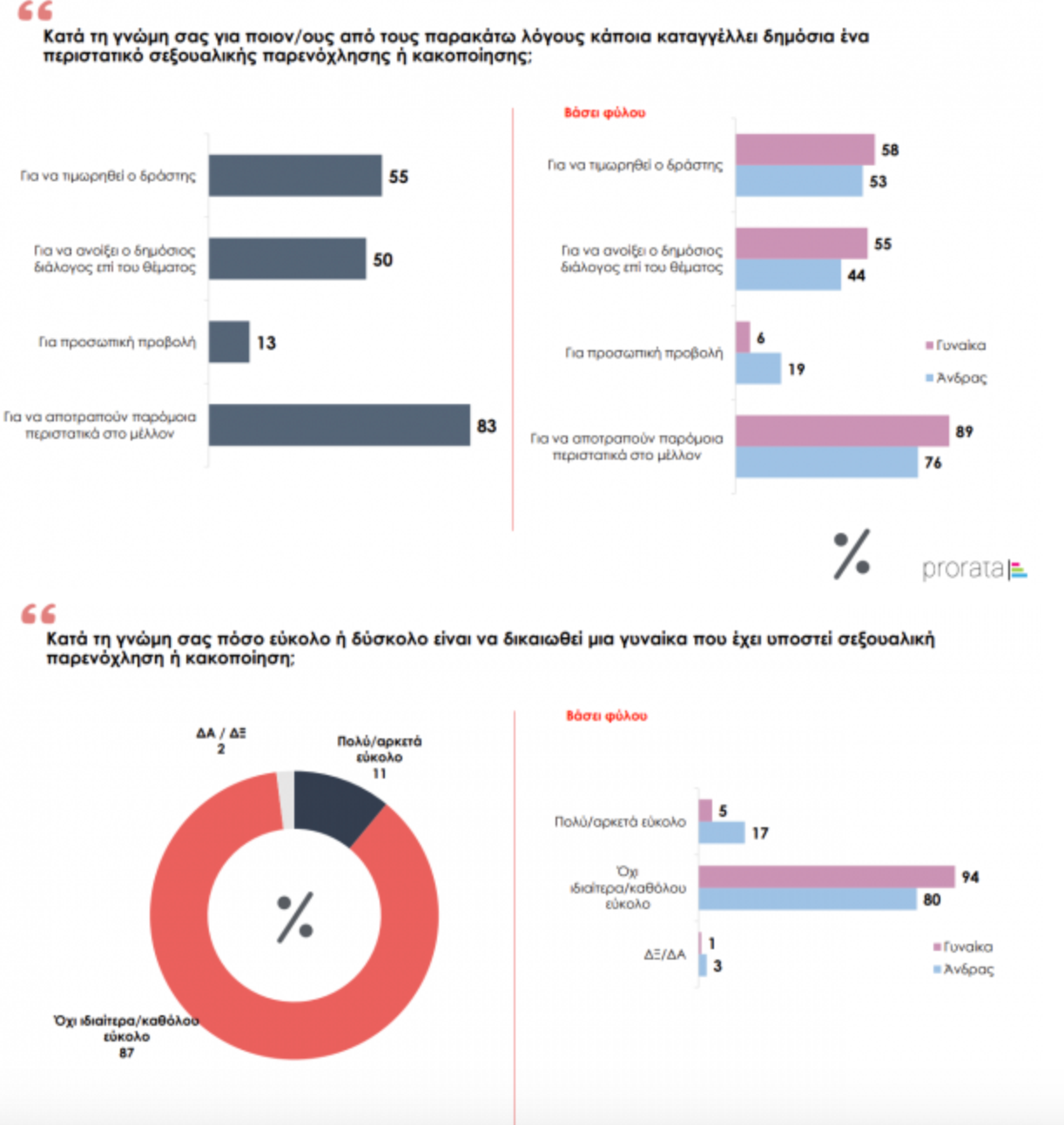 Παράλληλα, οι ερωτώμενοι συμμερίζονται με τρόπο καθολικό (87%) την άποψη ότι δεν είναι καθόλου εύκολο ή όχι ιδιαίτερα εύκολο να δικαιωθεί μια γυναίκα που έχει υπάρξει θύμα σεξουαλικής παρενόχλησης ή κακοποίησης.