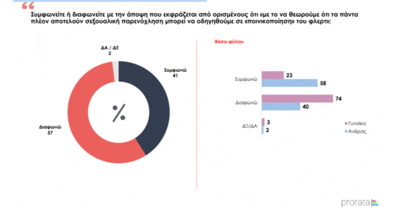 Ωστόσο, εξαιρετικά ανησυχητικό είναι το εύρημα που αποτυπώνει το εύρος της νομιμοποίησης της άποψης ότι «με το να θεωρούμε ότι τα πάντα πλέον αποτελούν σεξουαλική παρενόχληση μπορεί να οδηγηθούμε σε ‘‘ποινικοποίηση’’ του φλερτ».