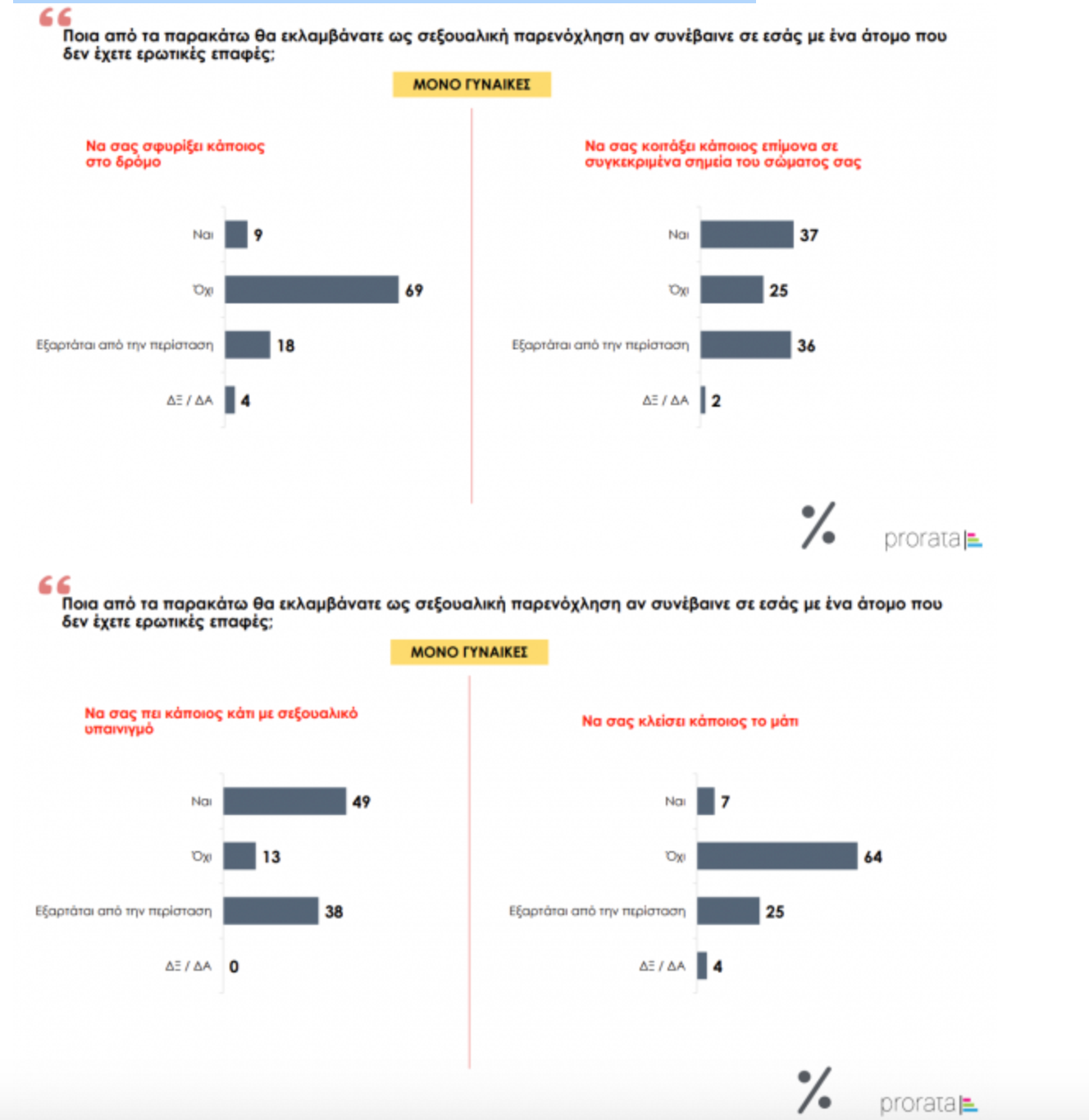 Φυσικά, σε όλα τα παραπάνω θα πρέπει να ληφθεί υπόψη ότι σημαντική μερίδα γυναικών απαντάει πως το αν είναι ή δεν είναι παρενόχληση το κάθε ένα από τα παραπάνω εξαρτάται και από την περίσταση.