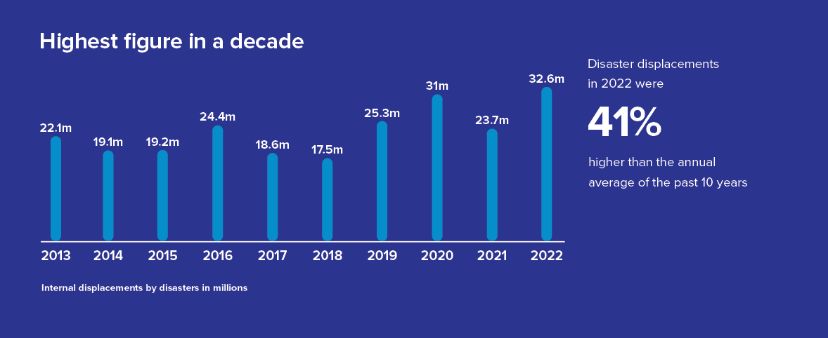 Κάθε χρόνο, εκατομμύρια άνθρωποι εκτοπίζονται λόγω καταστροφών. Πέρυσι, οι καταστροφές συμπεριλαμβανομένων των πλημμυρών στο Πακιστάν και του τυφώνα Νόρου στις Φιλιππίνες, οδήγησαν σε 32,6 εκατομμύρια εσωτερικούς εκτοπισμούς, τους υψηλότερους που έχουν καταγραφεί ποτέ. Ο αριθμός αναμένεται να αυξηθεί καθώς επιδεινώνεται η συχνότητα, η διάρκεια και η ένταση των φυσικών κινδύνων στο πλαίσιο της κλιματικής αλλαγής. Η Παγκόσμια Τράπεζα έχει προβλέψει ότι μέχρι το 2050 έως και 216 εκατομμύρια άνθρωποι θα μπορούσαν να γίνουν εσωτερικοί μετανάστες λόγω του κλίματος, εάν δεν αναληφθεί συντονισμένη δράση για το κλίμα.