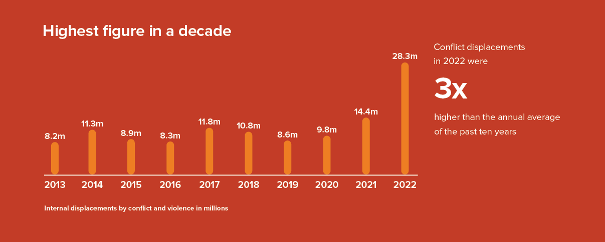 Η Παγκόσμια Έρευνα για τον Εσωτερικό Εκτοπισμό (GRID) 2023 δείχνει ότι οι συγκρούσεις και η βία προκάλεσαν 28,3 εκατομμύρια εκτοπισμούς, τον υψηλότερο αριθμό σε μια δεκαετία, με την Ουκρανία να καταλαμβάνει το 60 τοις εκατό του συνόλου.