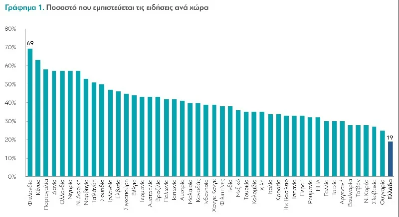 Ανάμεσα στις 46 χώρες του δείγματος, η Ελλάδα έχει το χαμηλότερο ποσοστό ερωτηθέντων που απαντούν πως εμπιστεύονται “τις περισσότερες ειδήσεις τις περισσότερες φορές” (19%). Σε σχέση με τη μέτρηση του 2022, παρατηρούμε μείωση 8 ποσοστιαίων μονάδων.