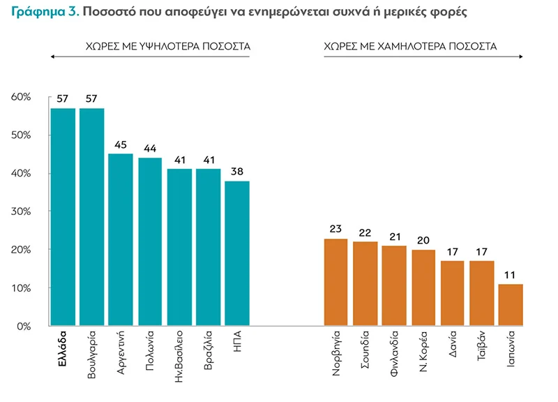 Τελευταία θέση μεταξύ 46 χωρών - Το 57% απαντά πως αποφεύγει ενεργά μερικές φορές ή συχνά την ενημέρωση.