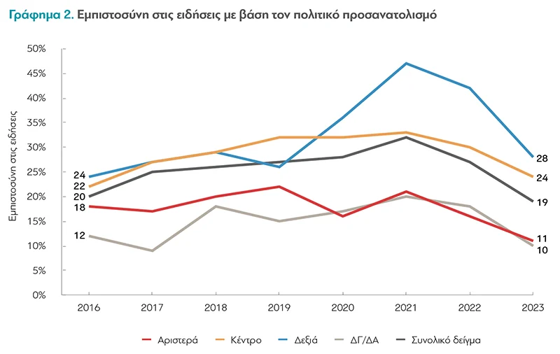 Διαπιστώνουμε πως τα χαμηλότερα ποσοστά εμπιστοσύνης παρατηρούνται διαχρονικά στους ερωτηθέντες οι οποίοι αυτοπροσδιορίζονται ως αριστεροί ή σε αυτούς που δεν θέλουν ή δεν γνωρίζουν πώς να τοποθετηθούν στον πολιτικό άξονα (αριστερά/δεξιά) -κατά κανόνα πολίτες με χαμηλό ενδιαφέρον για την πολιτική. Κατά τη διάρκεια της πανδημίας είδαμε αύξηση της εμπιστοσύνης στις ειδήσεις στην Ελλάδα, όπως και στις περισσότερες χώρες του δείγματος, αύξηση που όμως δεν κατάφεραν να καρπωθούν μακροπρόθεσμα τα μέσα ενημέρωσης. Παρατηρούμε πως φέτος η μείωση στην εμπιστοσύνη στις ειδήσεις σημειώθηκε ανάμεσα σε ερωτώμενους από όλο το πολιτικό φάσμα. Η μεγαλύτερη όμως μείωση σημειώθηκε ανάμεσα στους ερωτηθέντες που αυτοπροσδιορίζονται ως δεξιοί (από 42% το 2022 σε 28% το 2023). H μείωση στην εμπιστοσύνη μπορεί να οφείλεται εν μέρει στη συζήτηση σχετικά με την ελευθερία του Τύπου με αφορμή την έκθεση των Δημοσιογράφων Χωρίς Σύνορα ή με την κάλυψη της υπόθεσης των υποκλοπών η οποία αφορούσε και δημοσιογράφους.