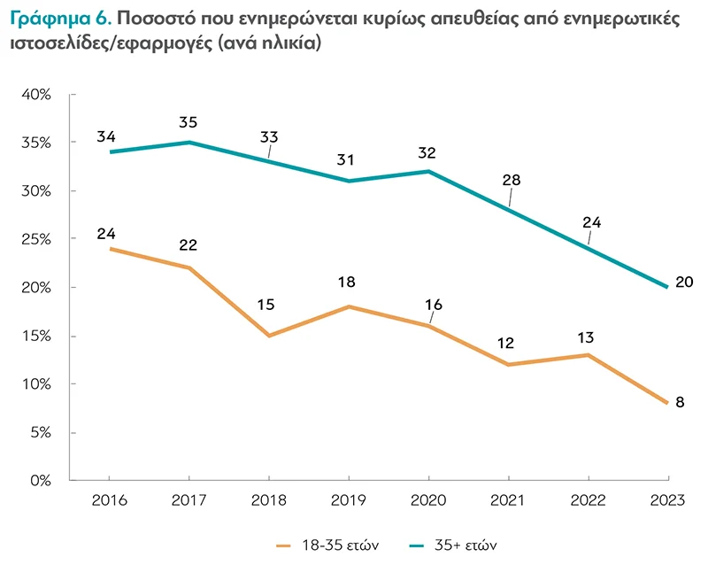 Όπως έχει παρουσιάσει διαχρονικά η έκθεση του Digital News Report, η αδιαμεσολάβητη ενημέρωση απευθείας από τις ιστοσελίδες και τις εφαρμογές μέσων ενημέρωσης έχει μειωθεί πολύ τα τελευταία χρόνια, ενώ έχει αυξηθεί η ενημέρωση μέσω ψηφιακών πλατφορμών, όπως τα Μέσα Κοινωνικής Δικτύωσης και οι μηχανές αναζήτησης. Μόλις το 20% των χρηστών του διαδικτύου άνω των 35 ετών προτιμούν να ενημερώνονται διαδικτυακά απευθείας από τα μέσα ενημέρωσης (με επίσκεψη στην κεντρική τους σελίδα ή στην εφαρμογή τους), ενώ στους νεότερους χρήστες (18-35 ετών) αυτό το ποσοστό έχει μειωθεί στο 8% από το 24% του 2016.