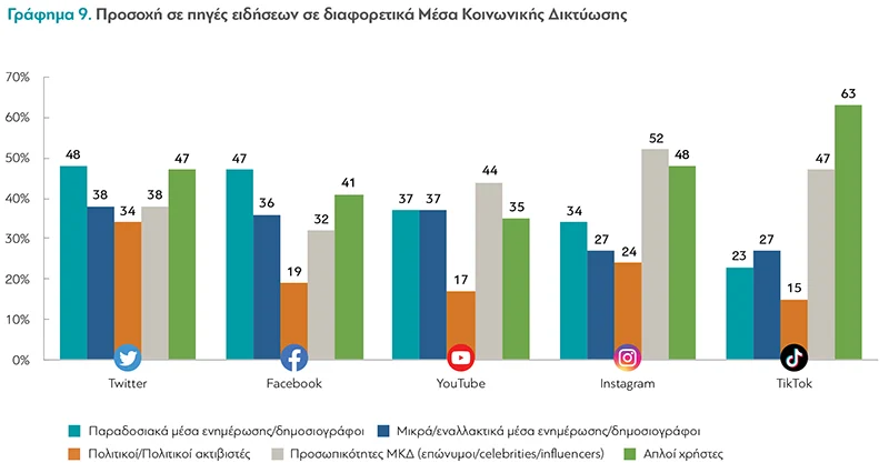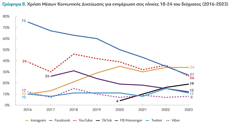 Παράλληλα, παρατηρούμε και άνοδο της χρήσης Μέσων Κοινωνικής Δικτύωσης που βασίζονται κυρίως στην εικόνα και σε προσωπικότητες (influencers, celebrities, επώνυμοι): το Instagram (18%) και το TikTok (9%). Το Twitter έχει ένα σταθερά μικρό κοινό τα τελευταία χρόνια στην Ελλάδα, όπως και σε πολλές άλλες χώρες, το οποίο αποτελείται κυρίως από πολιτικούς, δημοσιογράφους και πολιτικά πολωμένο κοινό.