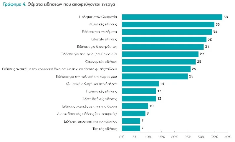 Στη φετινή έρευνα ρωτήσαμε αυτούς που αποφεύγουν τις ειδήσεις: α) ποια θέματα συνήθως αποφεύγουν και β) τι είδους ειδήσεις τους ενδιαφέρουν. Τα θέματα με τα μεγαλύτερα ποσοστά αποφυγής έχουν να κάνουν με τη ρωσική εισβολή στην Ουκρανία (38%) και τα αθλητικά (35%). Ακολουθούν ειδήσεις που σχετίζονται με το αστυνομικό ρεπορτάζ και εγκλήματα (34%), τη στιγμή που έχει αυξηθεί ο χώρος που αφιερώνεται σε αυτές τις ειδήσεις στα ελληνικά μέσα ενημέρωσης. Τα θέματα με τη λιγότερη ενεργή αποφυγή σχετίζονται με την επιστήμη και την τεχνολογία (7%) και τις τοπικές ειδήσεις (7%). Τα ευρήματά μας δεν σημαίνουν πως αυτά τα θέματα είναι απαραίτητα και τα πιο δημοφιλή, αλλά πως είναι λιγότερο πιθανό να τα αποφεύγει ενεργά το κοινό.