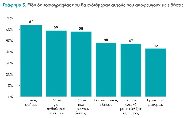 Το μέρος του δείγματος που αποφεύγει ενεργά την ενημέρωση ενδιαφέρεται λιγότερο για τις ειδήσεις σχετικά με τις εξελίξεις της ημέρας (47%) και περισσότερο για θετικές ειδήσεις (64%), ειδήσεις για ανθρώπους σαν και εκείνους (59%), και δημοσιογραφία που προτείνει λύσεις σε προβλήματα (58%) (solutions journalism), η οποία δεν έχει αναπτυχθεί ιδιαίτερα στην Ελλάδα.