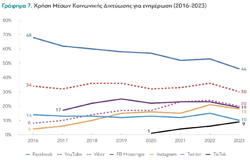 Ταυτόχρονα, έχει αλλάξει πολύ και η χρήση των Μέσων Κοινωνικής Δικτύωσης (MΚΔ). Το τοπίο της χρήσης ΜΚΔ για ενημερωτικούς σκοπούς (ανάγνωση, παρακολούθηση βίντεο, σχολιασμό, ή διαμοιρασμό ειδήσεων) είναι πλέον κατακερματισμένο. Το 2016 που ξεκίνησε η έρευνα στην Ελλάδα, περίπου 2 στους 3 χρήστες του διαδικτύου χρησιμοποιούσαν το Facebook για ενημέρωση (68%), ενώ σήμερα το χρησιμοποιούν λιγότεροι από τους μισούς (46%). Το YouTube παραμένει περίπου σταθερά στα ποσοστά του, ενώ υπάρχει άνοδος στη χρήση μέσων ανταλλαγής μηνυμάτων όπως το Viber και το Facebook Messenger για σχολιασμό και διαμοιρασμό ειδήσεων σε διαδικτυακές συνομιλίες.