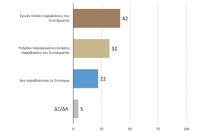 «Η ελληνική κοινωνία πιστεύει στο Σύνταγμα αλλά αμφισβητεί ότι εφαρμόζεται πιστά από τους κυβερνώντες και τη δικαιοσύνη, εκφράζοντας την ίδια δυσθυμία ή απογοήτευση που έχει διαπιστωθεί σε έρευνες για το πολιτικό σύστημα και τους θεσμούς.»