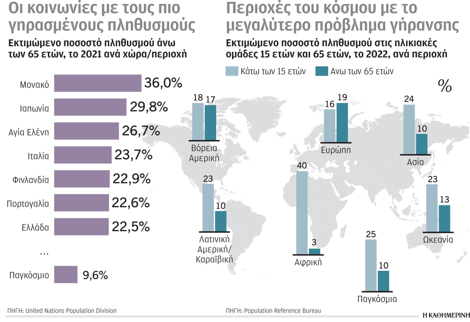 Ιαπωνία και Ιταλία στις πρώτες θέσεις των χωρών με υψηλό ποσοστό κατοίκων άνω των 65 ετών (36% και 23,7% αντίστοιχα). Φινλανδία (22,9%), Πορτογαλία (22,6%) ακολουθούν. Η Ελλάδα, δυστυχώς στην (ουσιαστικά) 4-5η χειρότερη χώρα του κόσμου, με ποσοστό 22,5%. Η Ευρώπη στην παγκόσμια χειρότερη αναλογία κατοίκων κάτω των 15 ετών (16%) και άνω των 65 (19%). Με την παγκόσμια αναλογία 25% και 10% αντίστοιχα και την Αφρική στα 40% και 3%, οι δημογραφικές προοπτικές της Γηραιάς Ηπείρου προβλέπονται τραγικές.