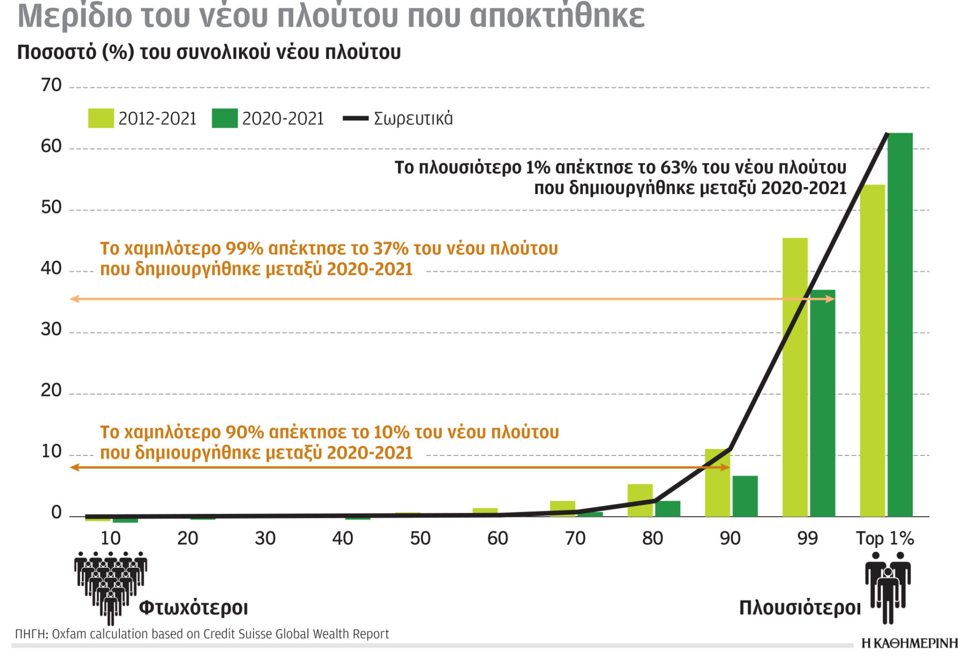 Με βάση μελέτη της Oxfam, το 1% των πλουσιότερων στον πλανήτη κατέχει το 63% του νέου πλούτου (42 τρισ. δολάρια) που παρήχθη το 2020. Από αυτά, μόλις τα 14 τρισ. δολάρια έφτασαν στο υπόλοιπο 99% των ανθρώπων. Υπολογίζεται ότι αρκούν 1,7 τρισ. δολάρια ετησίως για να βγουν από τη φτώχεια 2 δισεκατομμύρια άνθρωποι. Το πλουσιότερο 1% κατέχει το 45,6% του παγκόσμιου πλούτου, ενώ το φτωχότερο μισό του κόσμου μόλις το 0,75%. 81 δισεκατομμυριούχοι κατέχουν περισσότερο πλούτο από το 50% του κόσμου.