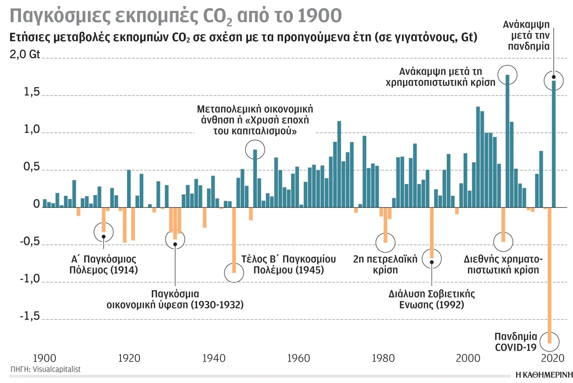 Μετά τη Βιομηχανική Επανάσταση, ο κόσμος εκπέμπει περισσόοτερο από 34 δισεκατομμύρια τόνους CO2 κάθε χρόνο. Από έτος σε έτος, οι μειώσεις εμφανίζονται σε εποχές κρίσεων, ενώ η μεγαλύτερη πτώση παρατηρήθηκε στα lockdowns (-2 δισεκατομμύρια τόνοι διοξειδίου του άνθρακα), μετά τα οποία όμως οι εκπομπές εκτινάχθηκαν. Οι εκπομπές από τις ανεπτυγμένες οικονομίες βρίσκονται σε διαρθρωτική πτώση με στόχο το κλιματικά ουδέτερο 2050.