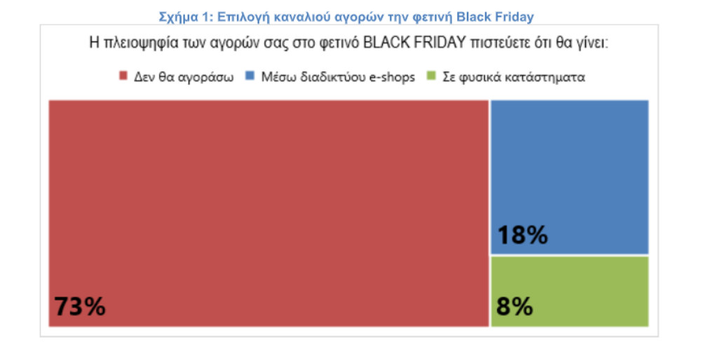 Όπως φαίνεται στο σχήμα 1, το 73% του καταναλωτικού κοινού δεν σχεδιάζουν να αγοράσουν την φετινή Black Friday. Από το υπόλοιπο 27%, το 18% (περίπου τα 2/3) σκόπευαν να κάνουν τις αγορές τους ούτως ή άλλως και πριν την απαγόρευση από ηλεκτρονικά καταστήματα μέσω διαδικτύου, ενώ το 8% σκόπευε να κάνει τις αγορές του μέσω φυσικών καταστημάτων, η πλειοψηφία των οποίων είναι πλέον κλειστά. Αυτή η μέτρηση αντιστοιχεί σε περίπου 2,3 εκατ. καταναλωτές οι οποίες εκτιμούν ότι θα πραγματοποιήσουν αγορές τη συγκεκριμένη χρονική περίοδο, η οποία τα τελευταία χρόνια είθισται να διαρκεί αρκετές ημέρες.