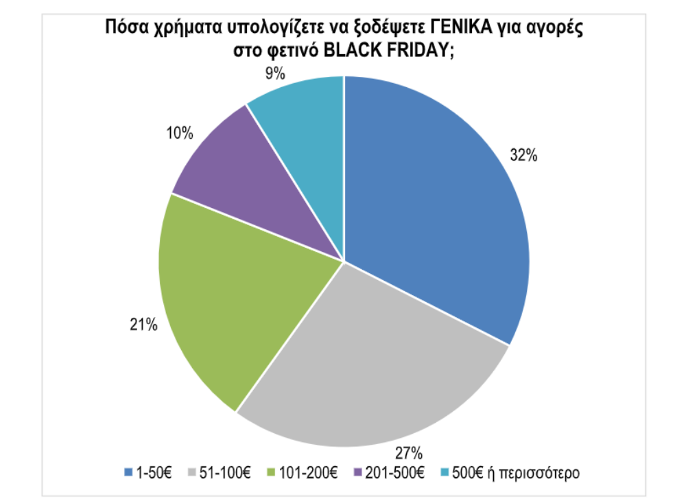 Όσον αφορά τη μέση δαπάνη, εκτιμάται ότι κατά μέσω όρο αυτά τα 2 εκατ. καταναλωτές θα πραγματοποιήσουν περίπου αγορές αξίας 140 ευρώ κατά μέσο όρο. Η πλειοψηφία το 32% εκτιμά ότι θα κάνει μικρές αγορές, μέχρι 50€, το 27% από 51 έως 100€, ενώ είναι αξιοσημείωτο ότι το 9% θα κάνει μεγάλες αγορές άνω των 500€ κάτι που σημαίνει ότι αναβάλουν σημαντικές οικιακές ανάγκες μέχρι να επιτύχουν σημαντικές προσφορές.