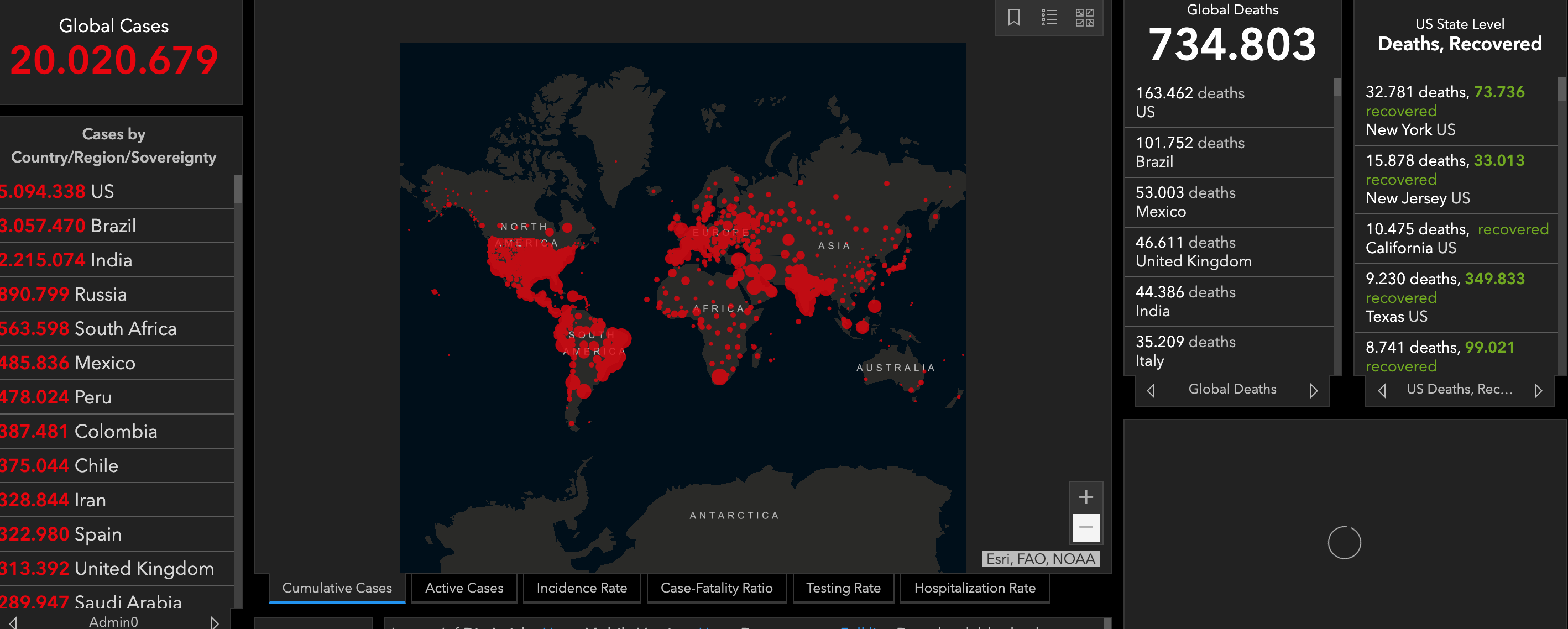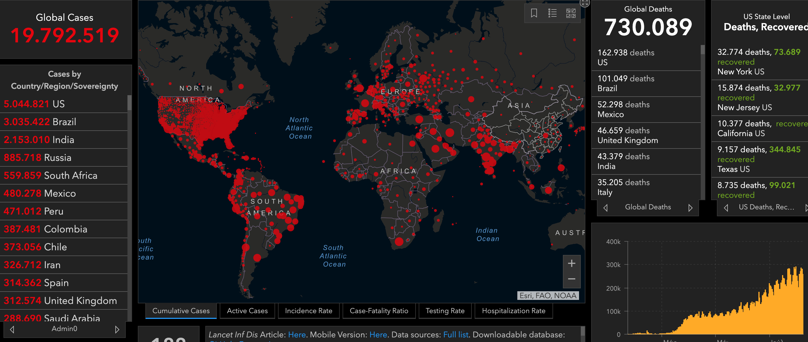 Συνολικά, έχουν ανακοινωθεί επίσημα τουλάχιστον 20.002.577 κρούσματα μόλυνσης από τον SARS-CoV-2 και 733.842 θάνατοι εξαιτίας της COVID-19.