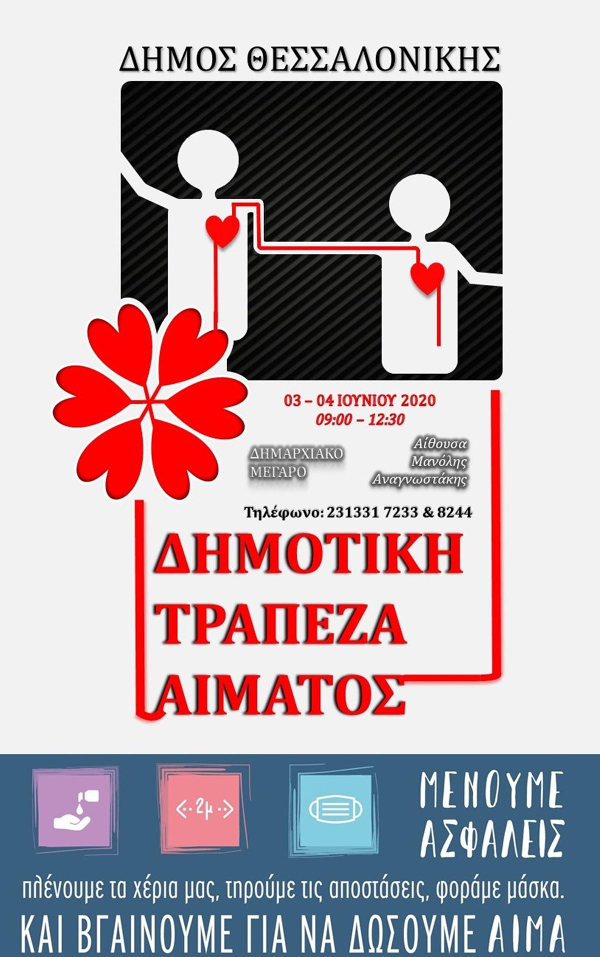 Η Δημοτική Τράπεζα Αίματος έχει προγραμματίσει τακτική Εθελοντική Αιμοδοσία στις 03 και 04 Ιουνίου, ώρα 09:00 – 13:00 στην Αίθουσα “Μανόλης Αναγνωστάκης” του Δημαρχιακού Μεγάρου Θεσσαλονίκης. (τηλ. 2313317233-8244) καλεί όλους τους εθελοντές αιμοδότες να συνεχίσουν να προσφέρουν αίμα-δώρο ζωής στους συνανθρώπους τους που το έχουν ανάγκη.