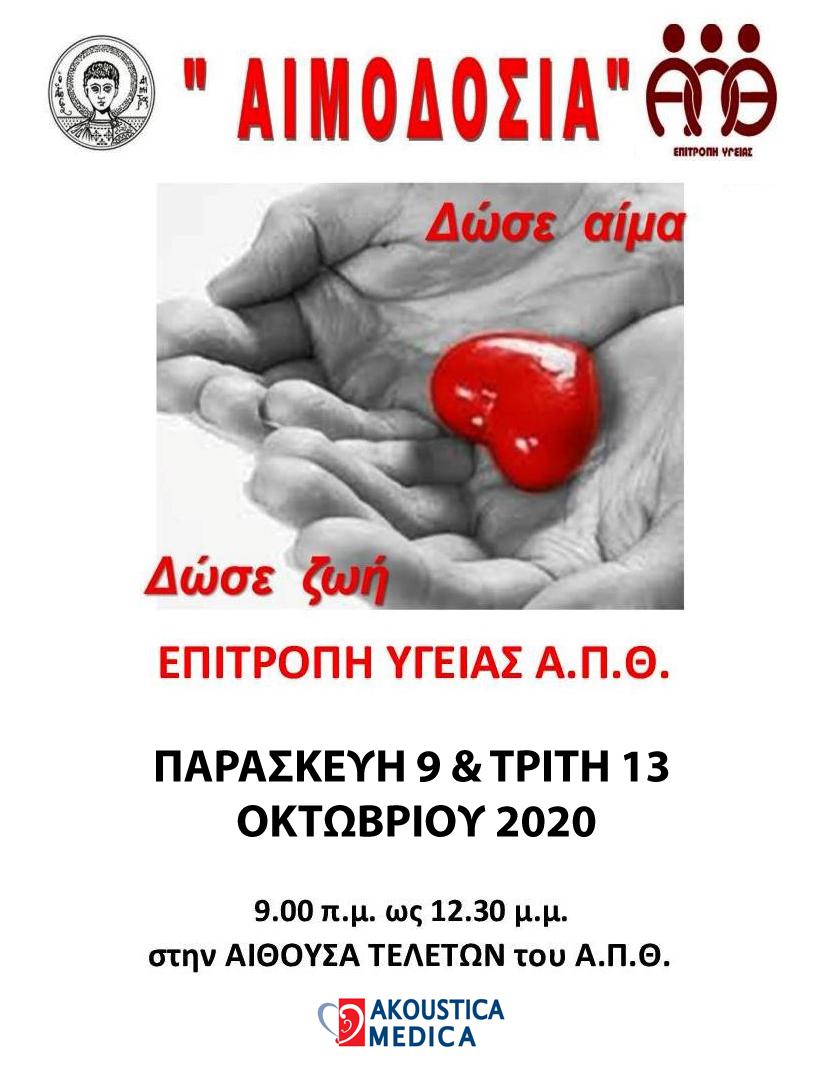 Η αιμοδοσία θα πραγματοποιηθεί την Παρασκευή 9 Οκτωβρίου και την Τρίτη 13 Οκτωβρίου 2020, από τις 9.00 έως τις 12.30, στην Αίθουσα Τελετών του ΑΠΘ.