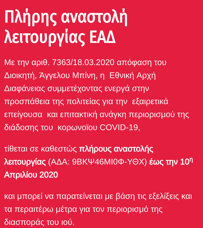 ”Με την αριθ. 7363/18.03.2020 απόφαση του Διοικητή, Άγγελου Μπίνη, η Εθνική Αρχή Διαφάνειας συμμετέχοντας ενεργά στην προσπάθεια της πολιτείας για την εξαιρετικά επείγουσα και επιτακτική ανάγκη περιορισμού της διάδοσης του κορωνοϊου COVID-19,