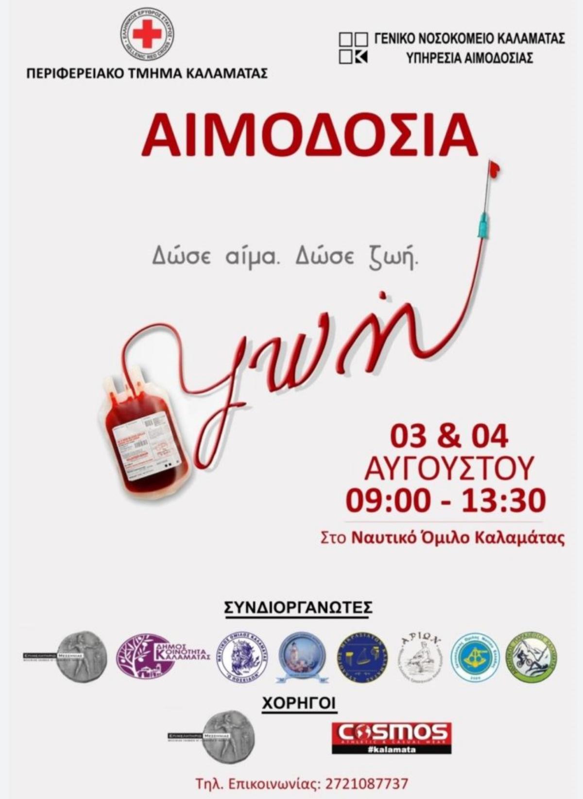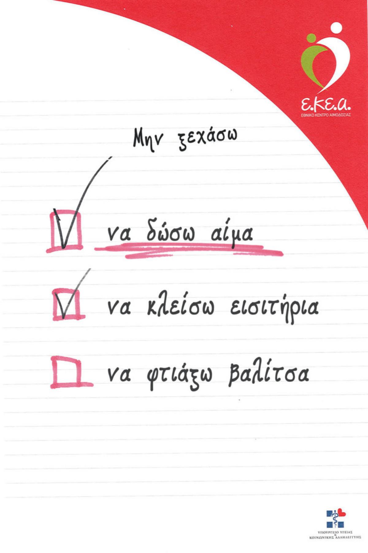 Λίγο πριν την έξοδο των εκδρομέων του Αυγούστου, το Εθνικό Κέντρο Αιμοδοσίας αναφέρει σε ανακοίνωσή του: «Οι ανάγκες για αίμα δεν κάνουν διακοπές. Σας καλούμε να προσφέρετε αίμα εθελοντικά στην πλησιέστερη σε εσάς Νοσοκομειακή Υπηρεσία Αιμοδοσίας, προκειμένου να καλυφθούν οι ανάγκες των πολυμεταγγιζόμενων ασθενών».
