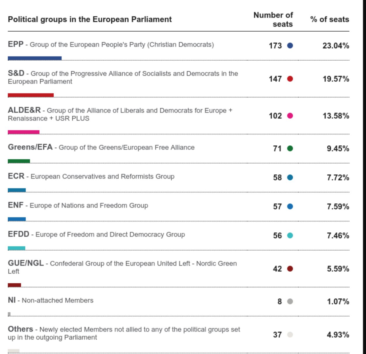 Τα στοιχεία αυτά βασίζονται σε εκτιμήσεις αποτελεσμάτων σε εθνικό επίπεδο όπως αυτές δημοσιεύθηκαν σε 11 χώρες (Αυστρία, Κύπρος, Γερμανία, Ιρλανδία, Μάλτα, Ολλανδία, Βουλγαρία, Κροατία, Γαλλία, Δανία, Σλοβακία) και των δημοσκοπήσεων που διεξήχθησαν πριν τις εκλογές στα υπόλοιπα 17 κράτη μέλη.