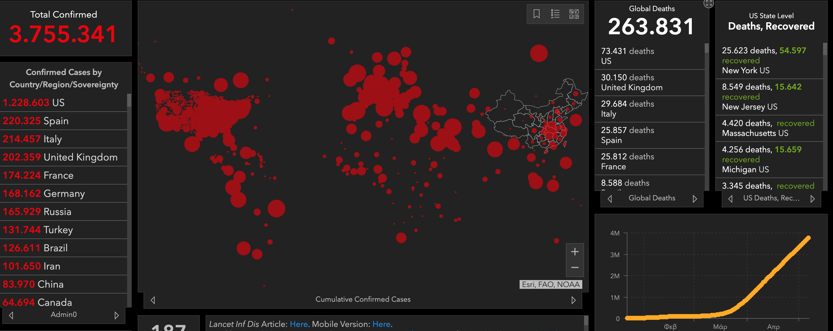 Μέχρι τις 22.00 απόψε (ώρα Ελλάδας) είχαν καταγραφεί περισσότερα από 3.710.240 επιβεβαιωμένα κρούσματα σε 195 χώρες και εδάφη. Ο αριθμός αυτός των διαγνωσμένων μολύνσεων, ωστόσο, αντανακλά μόνο ένα κλάσμα του πραγματικού αριθμού λοιμώξεων, με μεγάλο αριθμό χωρών να εξετάζουν μόνο τα κρούσματα που απαιτούν νοσοκομειακή περίθαλψη. Τουλάχιστον 1.153.300 από αυτούς τους ασθενείς έχουν πλέον αναρρώσει.