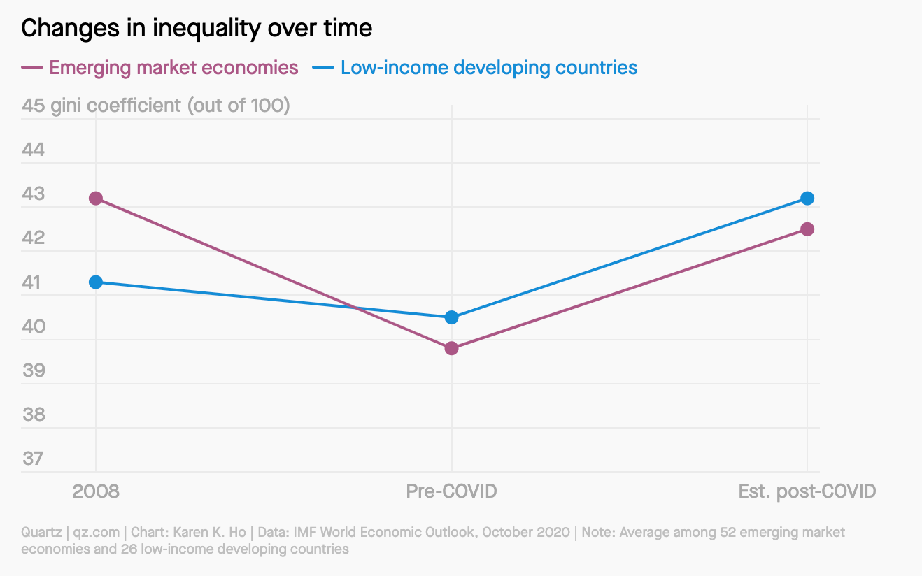 Πριν από την πανδημία, η ανισότητα στις αναδυόμενες αγορές και στις αναπτυσσόμενες χώρες με χαμηλό εισόδημα ήταν ήδη κακή σε σύγκριση με τις προηγμένες οικονομίες. Ενώ πολλές φτωχές χώρες έχουν σημειώσει πρόοδο στη μείωση της φτώχειας και στην αύξηση του προσδόκιμου ζωής, εξακολουθούν να αγωνίζονται με επίμονα υψηλή ανισότητα όσον αφορά την εκπαίδευση και την απασχόληση, ειδικά για τις γυναίκες και τους νέους. Η Αιθιοπία και το Πακιστάν είναι παραδείγματα χωρών που ακολούθησαν αυτήν την πορεία.