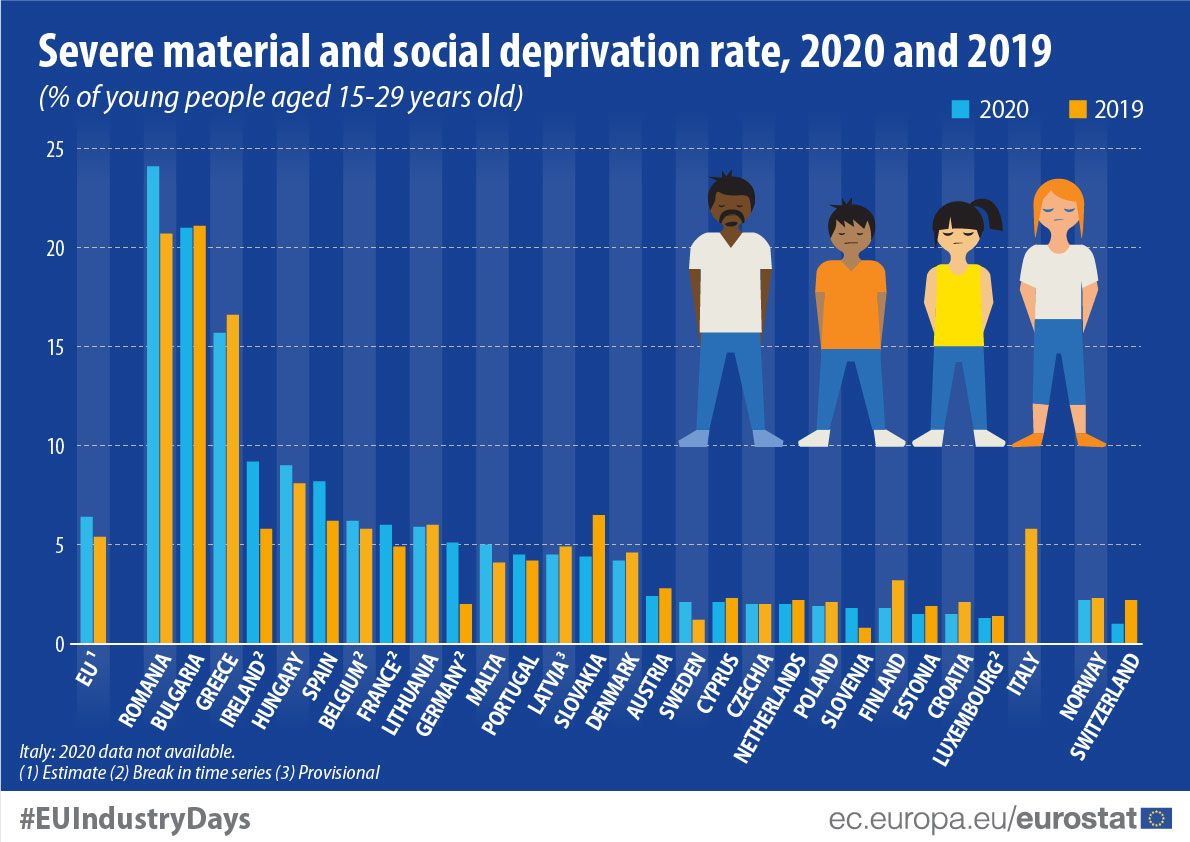 Συγκρίνοντας το 2020 με το 2019, οι μεγαλύτερες αυξήσεις στο ποσοστό σοβαρής υλικής και κοινωνικής στέρησης για τους νέους καταγράφηκαν στη Ρουμανία, την Ιρλανδία και τη Γερμανία (+3 ποσοστιαίες μονάδες. Ενώ, οι μεγαλύτερες μειώσεις καταγράφηκαν στη Σλοβακία (κατά 2 ποσοστιαίες μονάδες), στη Φινλανδία, στην Ελλάδα και στην Κροατία (κατά 1 ποσοστιαία μονάδα).