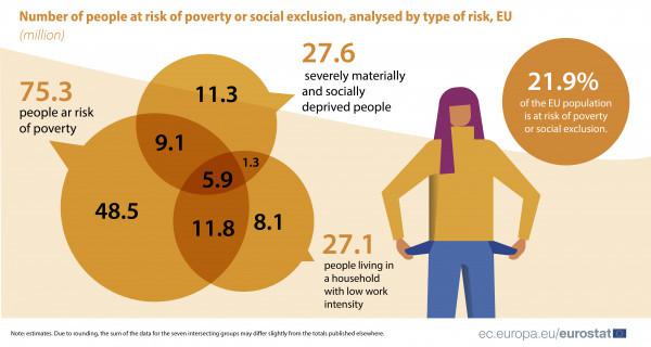 Μεταξύ των 96,5 εκατομμυρίων κατοίκων εντός της ΕΕ που αντιμετώπιζαν τον κίνδυνο της φτώχειας ή του κοινωνικού αποκλεισμού, περίπου 5,9 εκατομμύρια (1,3% του συνολικού πληθυσμού) διαβιούσαν σε νοικοκυριά που αντιμετωπίζουν ταυτόχρονα και τους τρεις κινδύνους φτώχειας και κοινωνικού αποκλεισμού (κίνδυνος φτώχειας, σοβαρή υλική και κοινωνική στέρηση, διαβίωση σε νοικοκυριό με πολύ χαμηλή εργασίας)
